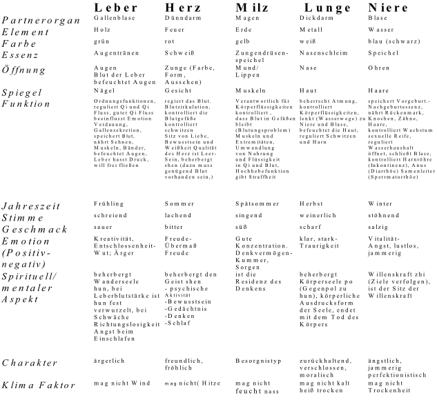Erst die ganzheitliche Betrachtung der traditionellen Chinesischen Medizin und die Zuordnung von Emotionen, Befindlichkeitsstörungen bzw. Krankheiten nach den Gesetzmäßigkeiten Yin und Yang (im weiteren Sinne auch der 5 Elemente) haben umfassende Auswertungen wie zum Beispiel die nachfolgende Organtabelle erbracht, die für den Therapeuten bei der Beobachtung des Patienten wertvolle Anhaltspunkte für das weitere Vorgehen erbringen:
